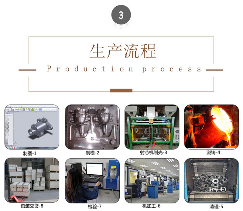 生產(chǎn)設(shè)備:樹脂砂鑄造、覆膜砂鑄造、失蠟鑄造、中頻電爐、爐前分析儀、退火爐等。