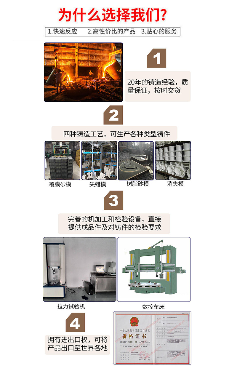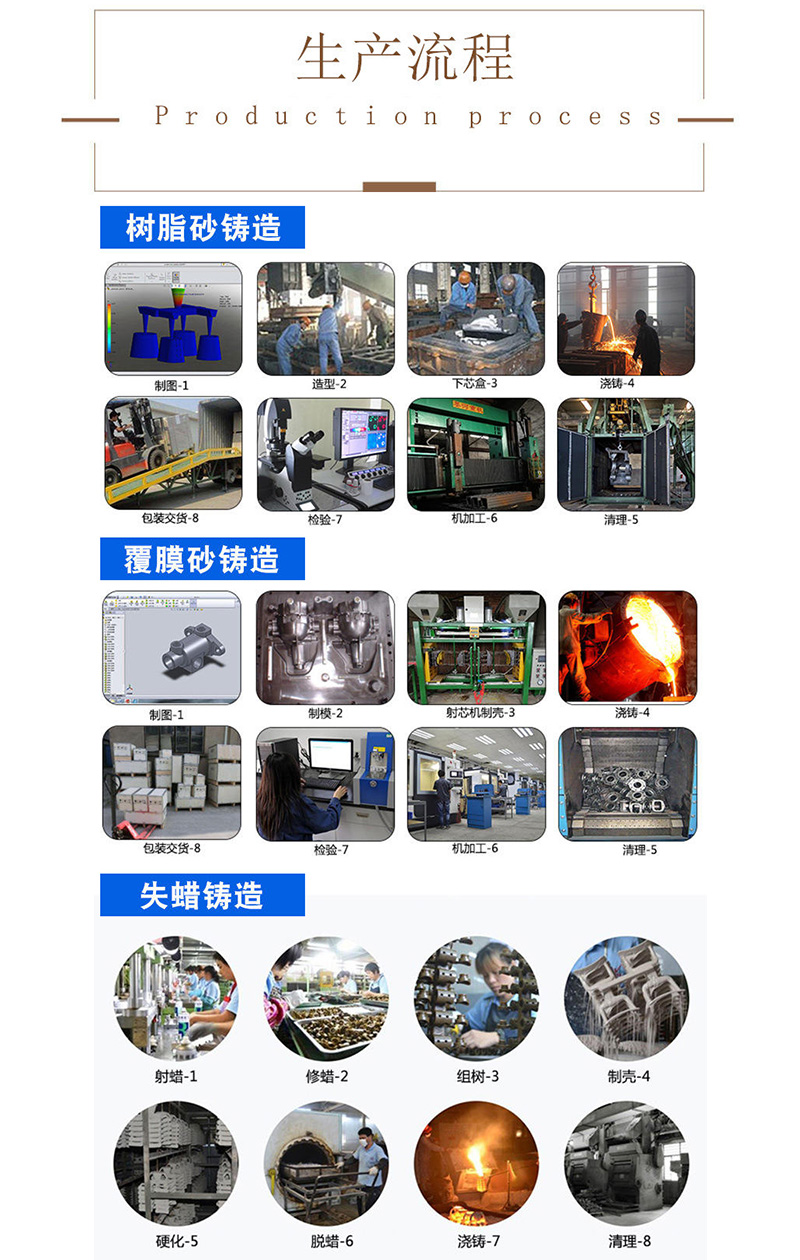 生產設備:樹脂砂鑄造、覆膜砂鑄造、失蠟鑄造、中頻電爐、爐前分析儀、退火爐等。