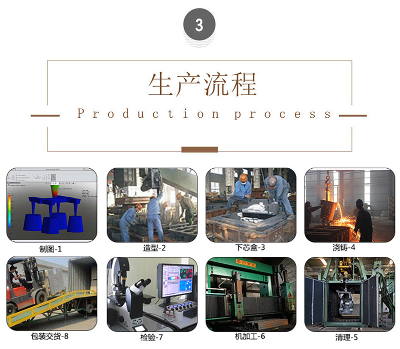 生產(chǎn)設(shè)備:樹脂砂鑄造、覆膜砂鑄造、失蠟鑄造、中頻電爐、爐前分析儀、退火爐等。